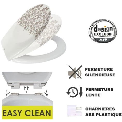 Abattant Wc de la marque MSV. HAUTE QUALITÉ: En matière Thermo-Dur avec charnières en plastique. La finition de haute qualité du siège Wc garantit une grande stabilité et une longue durée de vie. SYSTÈME EASY CLEAN: Son systeme Easy clip facilite considérablement le nettoyage du siège, il suffit de clipser pour le fixer, déclipser pour nettoyer et le tour et joué ! MÉCANISME FERMETURE LENTE: Avec cet abattant, finit les bruits dérangeants et les claquements. L’abattant Wc est doté d’un mécanisme de frein de chute en douceur intégré pour une fermeture silencieuse du couvercle. Le dessous est muni de crampons pour éviter les glissades ou les bruits forts. TENDANCE: Donnez à votre salle de bain non seulement un confort parfait, mais aussi une ambiance tendance. INFORMATION PRODUIT: Dimensions: 45,5x37x5cm Couleur: Marron Matière: Thermo Dur