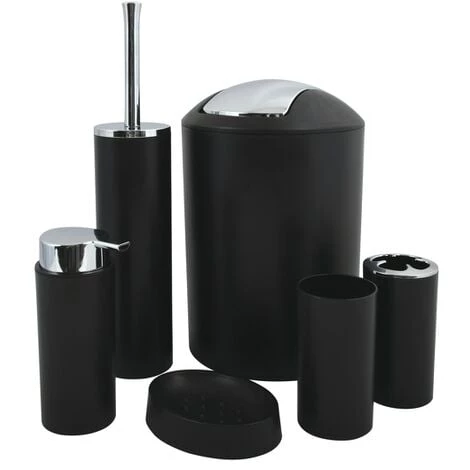 Set de salle de bain de la marque MSV. Idéal pour aménager la salle de bain de manière chic et élégante. Un lot d’accessoires qui comporte tous les indispensables d’une salle de bain : gobelet, distributeur de savon,porte savon, porte brosse à dent, brosse Wc, et une poubelle de bain 6L. Un design minimaliste et accroche regard pour une salle bain complet. Dimensions: (distributeur de savon: 6,4×8,7×17,5cm/350ml), (Gobelet: 6,4x13cm), (Porte brosse à dent: 6,4×13,2cm)(Porte savon:12,3x9x3cm), (Brosse Wc: 7,3x39cm), (Poubelle:19x30cm/6L) Couleur: Noir mat Matière: PP
