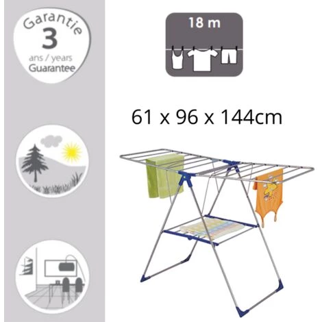 Etendoir de la marque MSV. Parfait pour faire sécher convenablement et aisément votre linge encombrant (vêtements et tissus délicats) sans qu’ils se froissent et se rétrécissent tout en optimisant votre espace de buanderie ou n’importe quelle pièce de votre maison. Vous n’aurez plus à faire sécher votre linge humide n’importe ou. Après chaque utilisation, l’étendoir peut être facilement rangé et plié dans un coin. Dimensions: 61x96x144cm Couleur: Blanc Matière: Inox