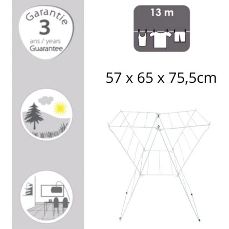 Etendoir de la marque MSV. Parfait pour faire sécher convenablement et aisément votre linge encombrant (vêtements et tissus délicats) sans qu’ils se froissent et se rétrécissent tout en optimisant votre espace de buanderie ou n’importe quelle pièce de votre maison. Vous n’aurez plus à faire sécher votre linge humide n’importe ou. Après chaque utilisation, l’étendoir peut être facilement rangé et plié dans un coin. Dimensions: 57x65x75.5cm Couleur: Blanc Matière: Acier