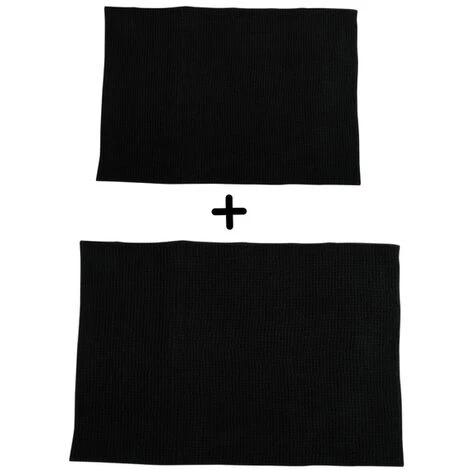 Lot de 2 tapis de la marque MSV. Une touche de modernité dans votre pièce. Profitez de deux tapis chaud et moelleux fabriqués en chenille microfibre pour commencer la journée. D’une douceur et d’une densité exceptionnelle, les tapis assurent également que vous ne glissez pas sur les carreaux après une douche ou un bain chaud. Ils absorbent une quantité d’humidité considérable, ce qui leur permet de sécher rapidement. Adapté au sèche-linge et offre donc un plus en matière d’hygiène. Utilisation polyvalente : convient à toutes les pièces, que ce soit comme tapis de salle de bain, tapis dans la chambre à coucher ou comme tapis dans le dressing. INFORMATION PRODUIT: Couleur: Noir, Matière:100% Polyester, Dimensions: 40x60cm + 60x90cm.