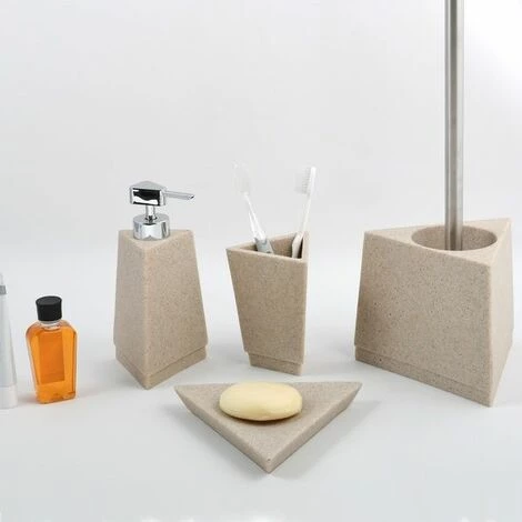 Lot de 4 accessoires de salle de bain en Polyrésine SUEZ Sable de la marque MSV. Elégant et pratique, ce set complet de salle de bain apportera une touche de modernité dans votre salle de bain. Composé d’un Distributeur de savon, Gobelet, Porte savon, Brosse WC en Polyrésine. Facile à nettoyer et à entretenir. Dimensions: Ditributeur 18cm; Gobelet 11,5cm; Porte savon 2cm; Brosse Wc 30cm