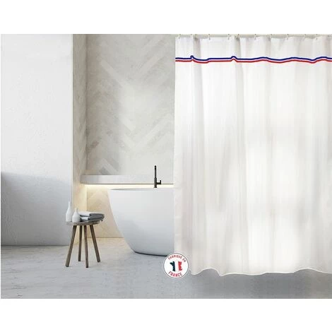 Rideau de douche Français de la marque MSV. Revivez chaque matin, le charme à la Française ! Ce rideau classique est orné d’un simple liseret bleu, blanc, rouge. Ce ruban lui prodigue une puissance symbolique. La simple représentation de ces trois couleurs expose alors toute l’élégance d’une petite touche à la Française… Certifiés << Confiance Textile: Tissu est imperméable: Il a la cactéristique d’être anti-moisissure et antibactérien. Testé en laboratoire, il est certifié sans substances nocives. Dimensions: 180x200cm Couleur: Blanc Matière: Polyester