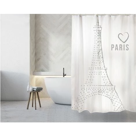 Rideau de douche Français de la marque MSV. Qui n’a pas rêvé d’une demande en mariage sous la Dame de fer ? Ce rideau de douche Français n’est pas de Gustave ! Il représente une déclaration d’amour à l’être aimé ou à Paris !… Ce joli << coeur >> – au sens large du terme – vous séduira aussi bien par son graphisme que par son effet étincelant et argenté. Certifiés << Confiance Textile: Tissu est imperméable: Il a la cactéristique d’être anti-moisissure et antibactérien. Testé en laboratoire, il est certifié sans substances nocives. Dimensions: 180x200cm Couleur: Argenté Matière: Polyester