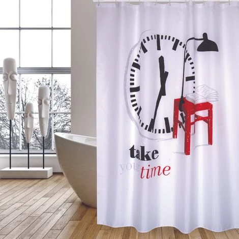Le rideau de douche en plastique Take Your Time de MSV mesure 180 cm de large et est imperméable. Il est muni d’ourlets cousus et d’œillets pour les anneaux.